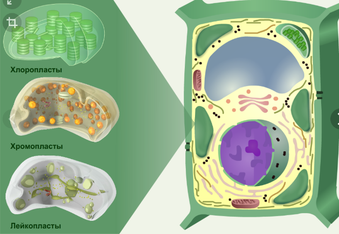 В цитоплазме растительной клетки находятся многочисленные мелкие тельца — пластиды. При большом увеличении пластиды хорошо видны. В клетках разных органов растений число их различно.